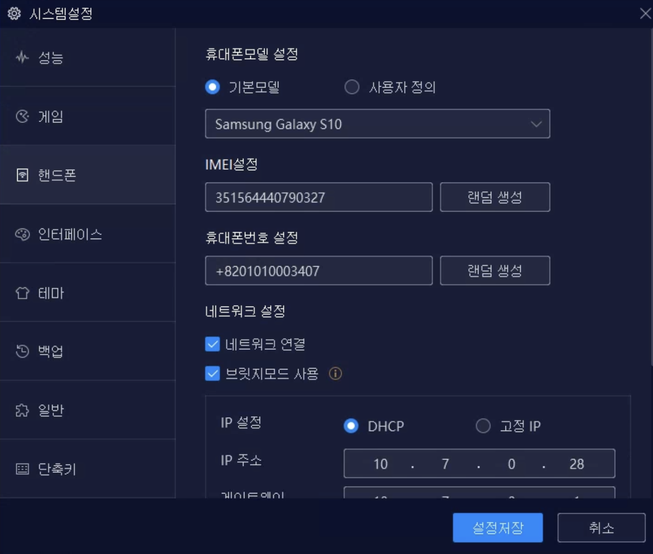 2. '핸드폰' 탭에 브릿지모드 사용 클릭. 역시 녹스가 재시작 된다.